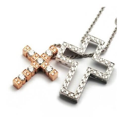 Croce con catena in oro bianco, chiusura a moschettone con scritta Damiani e brillanti. Collana regolabile con 2° anello.