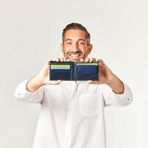 Portafoglio uomo pelle Nappa di vitello multicolore con portamonete. Linee semplici e design funzionale, un accessorio perfetto per avere sempre a portata di mano banconote e documenti.
