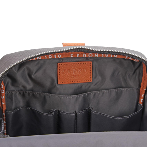 • Tasca posteriore laterale con zip, tracolla regolabile in tessuto con dettagli in pelle, logo Fedon 1919 stampato a caldo.
