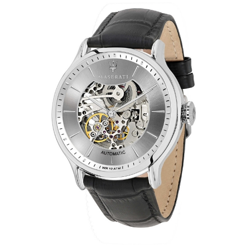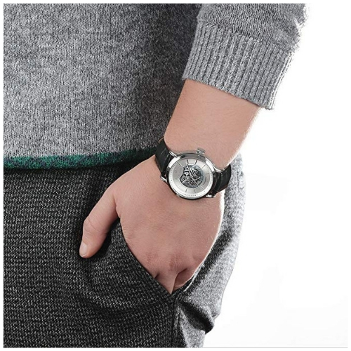 Orologio automatico da uomo della collezione ricordo. Cassa in acciaio con finitura lucida e diametro di 42mm, quadrante argento e bianco brillante e vetro minerale. Il cinturino è in pelle con fibbia ardiglione. Orologio resistenza all’acqua di 5 atm.