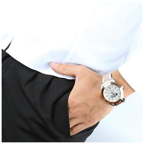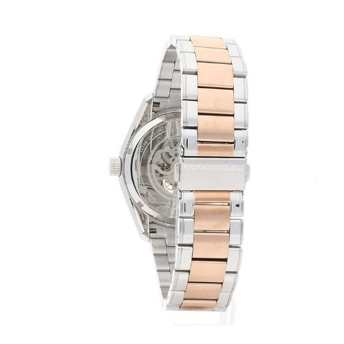 Orologio automatico da uomo della collezione traguardo. Modello realizzato in acciaio e oro rosa. Dimensione quadrante 45 mm. Orologio con quadrante di colore sabbiato con argento bianco e con cinturino in metallo di colore argento e oro rosa, chiusura a deployment con pulsanti. Resistenza all’acqua di 10 atm.