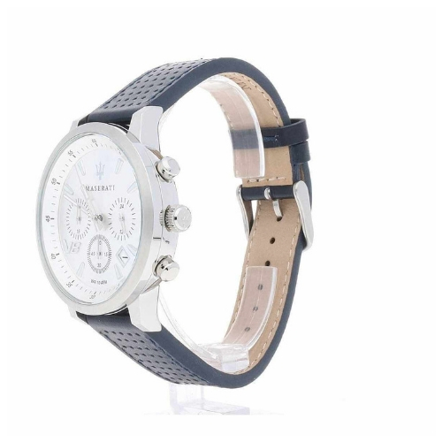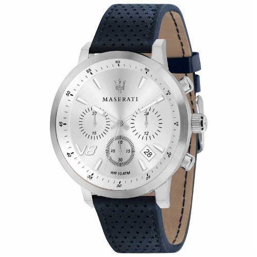 Orologio cronografo della collezione Gt. modello con cassa in acciaio della dimensione di 50,8 x I44 mm, quadrante di colore argento bianco brillante e vetro minerale. Il cinturino è in pelle di colore blu con fibbia ardiglione.