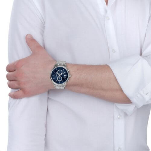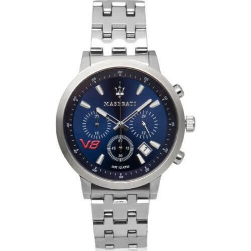 Orologio cronografo da uomo di maserati della collezione GT. Modello con cassa in acciaio lucido della dimensione di 44mm, quadrante di colore sunray blu e vetro minerale. Il cinturino è in acciaio di colore argento con deployment con pulsanti.