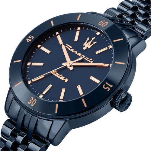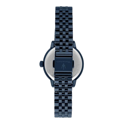 Orologio solo tempo da donna di maserati della collezione solar blue. Orologio solare con cassa di forma rotonda realizzata in acciaio di colore blu di dimensioni 32 mm e con cinturino realizzato in acciaio di colore blu. Il quadrante è di colore blu e il vetro è minerale. Resistenza all’acqua: 5 atm.