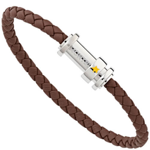 Il bracciale Le Petit Prince in pelle marrone intrecciata con chiusura in acciaio e tre anelli si ispira all’aviatore, simbolo di una figura di riferimento e del rapporto fra padre e figlio.