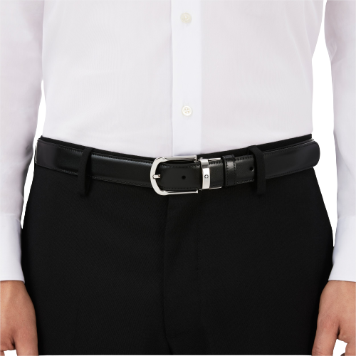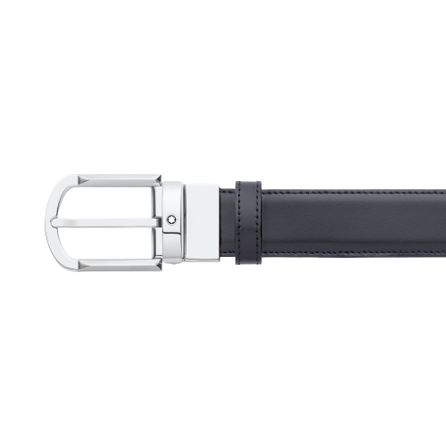 Fibbia ad ardiglione arrotondata a ferro di cavallo con sistema “revolving” finitura palladio lucido con emblema Montblanc. Cinghia in pelle reversibile nera e marrone, 3 cm x 120 cm.