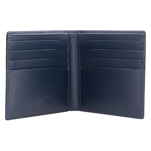 Vacchetta pieno fiore blu navy di provenienza europea, effetto lucido esclusivo Montblanc, 8 tasche per carte di credito, 2 scomparti per banconote, 2 tasche extra.