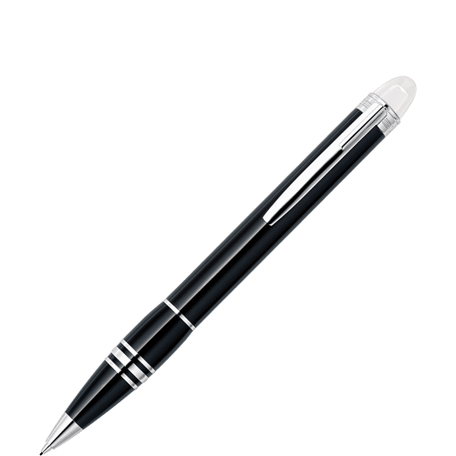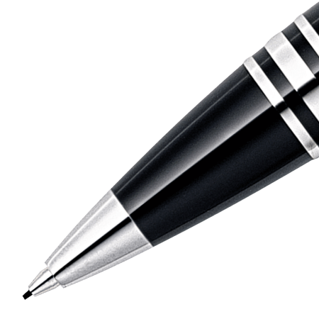 Portamine con meccanismo a rotazione, mina 0,7 mm, serbatoio in pregiata resina nera, cap top trasparente con emblema Montblanc fluttuante, anelli e clip finitura platino