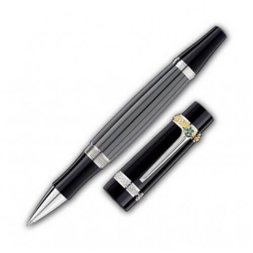 Con questa edizione limitata Montblanc rende omaggio a Honoré de Balzac, creando uno strumento da scrittura straordinario proprio come il celebre scrittore. La forma e il design ricordano l’inconfondibile figura e l’abbigliamento di Balzac, con le scarpe appuntite a cui si ispira la forma del cono. Il cappuccio in resina nera di alta qualità e il corpo color grigio scuro, decorato con strisce sottili, rendono omaggio al “tight” – un elemento indispensabile nel guardaroba di Balzac. Lo scrittore portava spesso un bastone da passeggio magnificamente decorato, a cui si ispira la clip finitura platino con inserto in turchese.