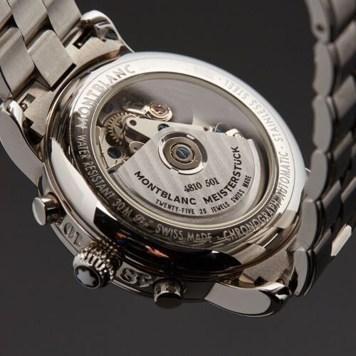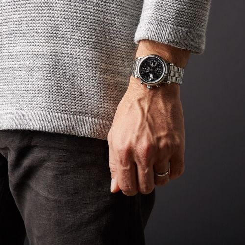 Cassa in acciaio inossidabile con cinturino a maglie in acciaio inossidabile. Quadrante nero con lancette rodiate e indici arabi. Tre: quadranti secondari di 12 ore, 30 minuti e 60 secondi. Movimento automatico. Vetro zaffiro resistente ai graffi. Fondello in vetro zaffiro trasparente. Diametro della cassa: 38 mm. Resistente all’acqua a 30 metri. Funzioni: ore, minuti, secondi, calendario, cronografo.