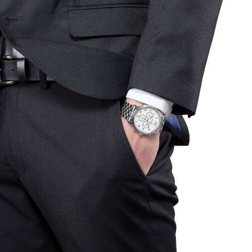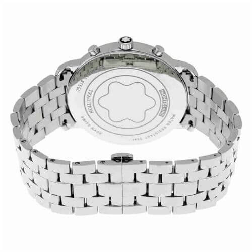 Il Montblanc Tradition Chronograph riflette il caratteristico design Montblanc, ma anche i codici dell’arte orologiera classica. La cassa in acciaio pregiato presenta le tipiche anse diritte Montblanc e una nuova lunetta dalla forma doppia con vetro zaffiro bombato. Il design esprime i classici codici dell’arte orologiera, come il quadrante in madreperla bianca con numeri romani e il numero romano XII grande.
