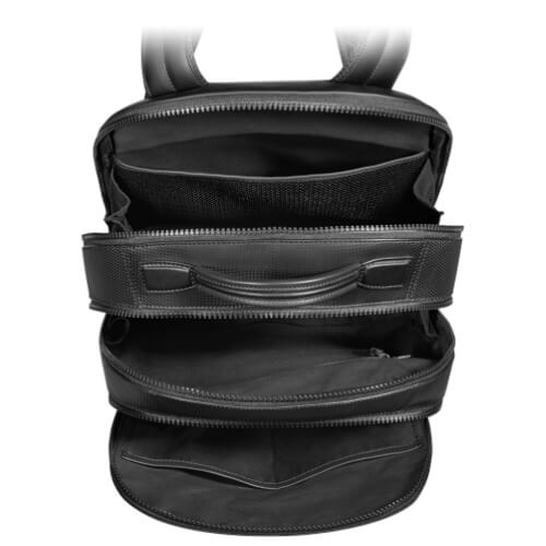 Con il suo audace colore nero, il mix di pelle liscia e con stampa effetto fibra di carbonio e le finiture metalliche nere opache, questa borsa è la compagna ideale per i giovani professionisti che vivono intensamente la loro vita urbana. Lo zaino piccolo ha 3 scomparti principali, 1 tasca anteriore aperta. Interno: scomparto imbottito per computer portatile, 2 tasche per telefoni cellulari, 1 tasca aperta imbottita, 1 tasca con cerniera, 3 passanti per strumenti da scrittura.