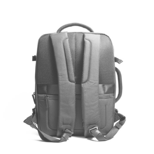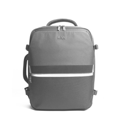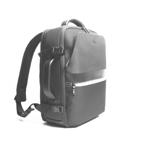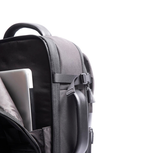 Zaino da viaggio della linea Aero in tessuto liscio e tessuto tramato con inserti in PU e una tasca frontale catarifrangente con zip. Organizzazione interna: comparto principale con elastici ferma indumenti e tasca a rete chiusa con zip, comparto frontale con due tasche aperte e portachiavi amovibile, comparto posteriore dedicato al trasporto del computer. Altri accessori: trolley sleeve, tasca nascosta con protezione RFID, 4 fibbie lateriali di sicurezza e doppio manico, superiore e laterale.