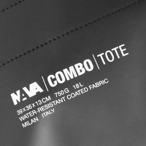 La tote bag della linea Combo è la borsa adatta a chi ama gli outfit urban e lifestyle. Il design essenziale è interrotto solamente dal cartiglio realizzato in serigrafia con le specifiche tecniche della borsa. Forme squadrate, materiale tecnico liscio e resistente all’acqua con manici in tessuto e accessori metallici disegnati ad hoc. All’interno un contenitore essenziale molto capiente con una busta chiusa con zip per riporre gli oggetti più preziosi, amovibile e utilizzabile anche da sola.