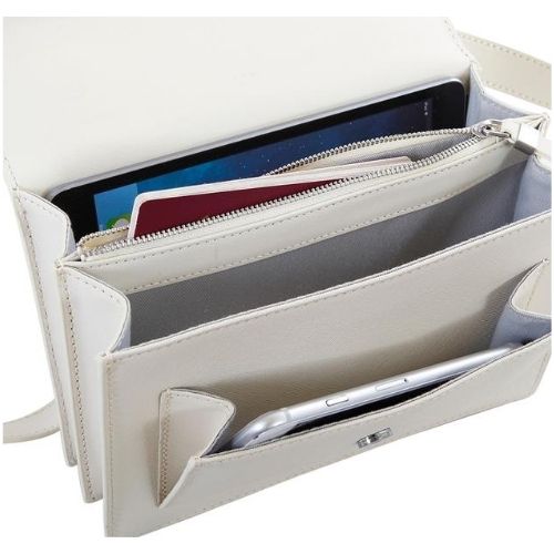 Mini bag della linea “Via Durini” realizzata in pelle saffiano e pelle liscia con tasca frontale e tracolla regolabile per agevolare la portabilità spalla/tracolla. Un accessorio al contempo pratico ed elegante, dotato di comparto interno con divisorio chiuso da zip e accessori in metallo satinato. Chiusura con calamita.
