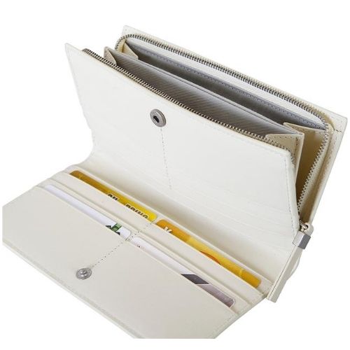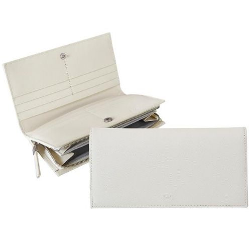 Portafoglio da donna della linea “Via Durini” realizzato in pelle saffiano e pelle liscia con dettagli in metallo satinato. Un accessorio pratico e contemporaneo adatto a contenere fino a 12 cc, con comparto esterno chiuso da zip per monete e banconote.