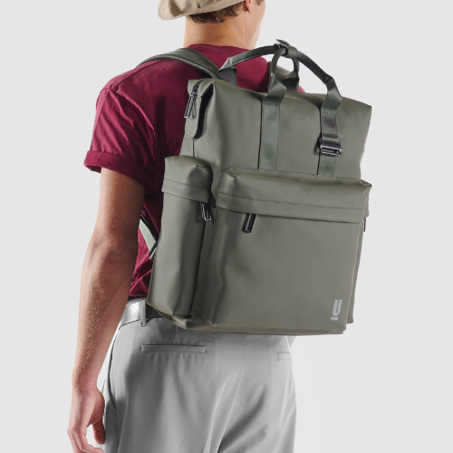 Zaino con tasche per uomo e donna, realizzato in eco-tech PU a un comparto con chiusura a cerniera water resistant. Grande tasca frontale e due tasche laterali con zip e rain cover. All’Interno custodia imbottita per laptop estraibile (pc da 13.3” a 15.6”) con chiusura a bottone automatico e attacco interno con bottoni automatici. Magneti laterali per agevolare l’accesso al comparto principale, stringi-maniglia in eco-tech PU, spallacci regolabili e moschettone esterno in metallo.