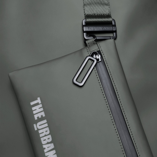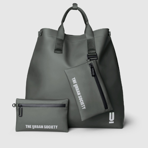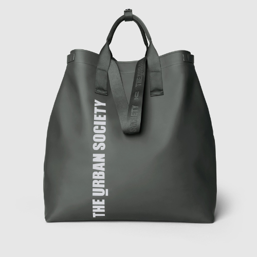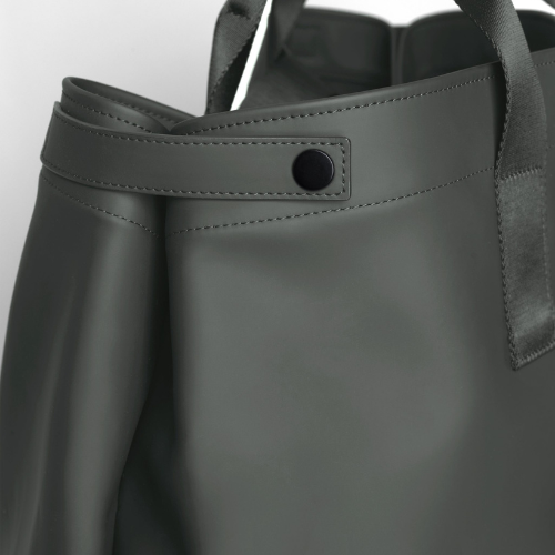 Borsa shopping per donna e uomo, realizzata in eco-tech PU di grandi dimensioni con costruzione quasi invisibile. Maniglie in nylon riciclato per portarla a mano, manici lunghi in nylon riciclato con logo in trama jacquard per indossarla a spalla. Due pouches interne con logo catarifrangente e anellino per aggancio a “sistema”, dotate di cerniera water resistant collegabili alla borsa tramite bottoni automatici. Moschettone esterno in metallo e lacci laterali automatici per ridurre le dimensioni.